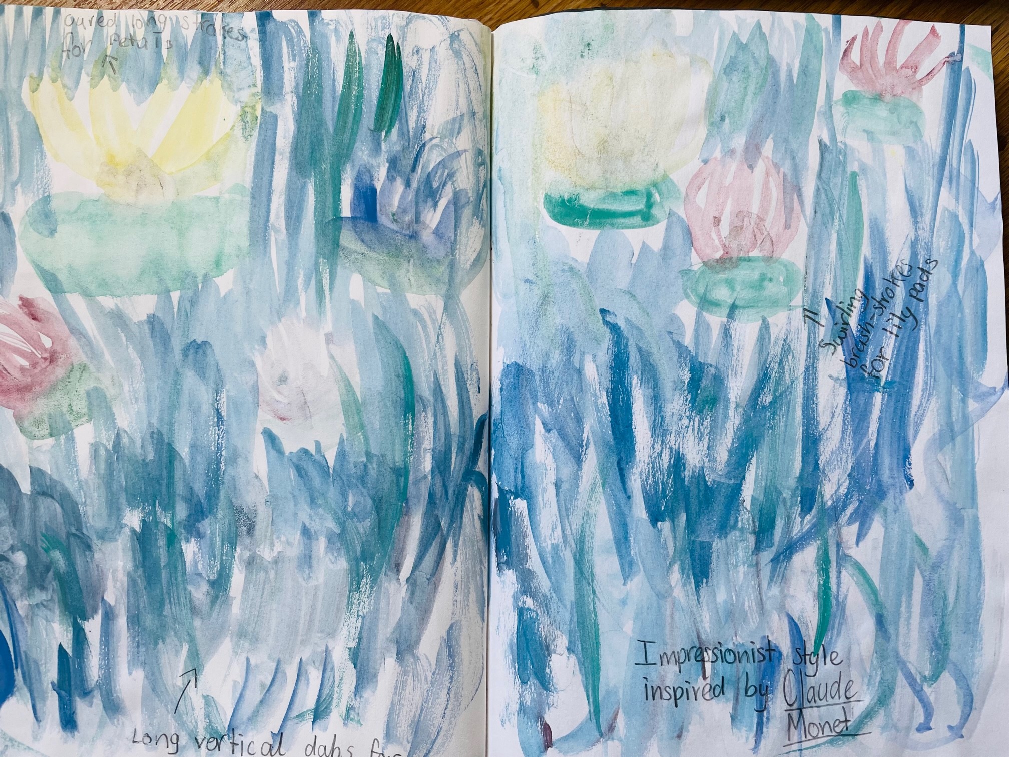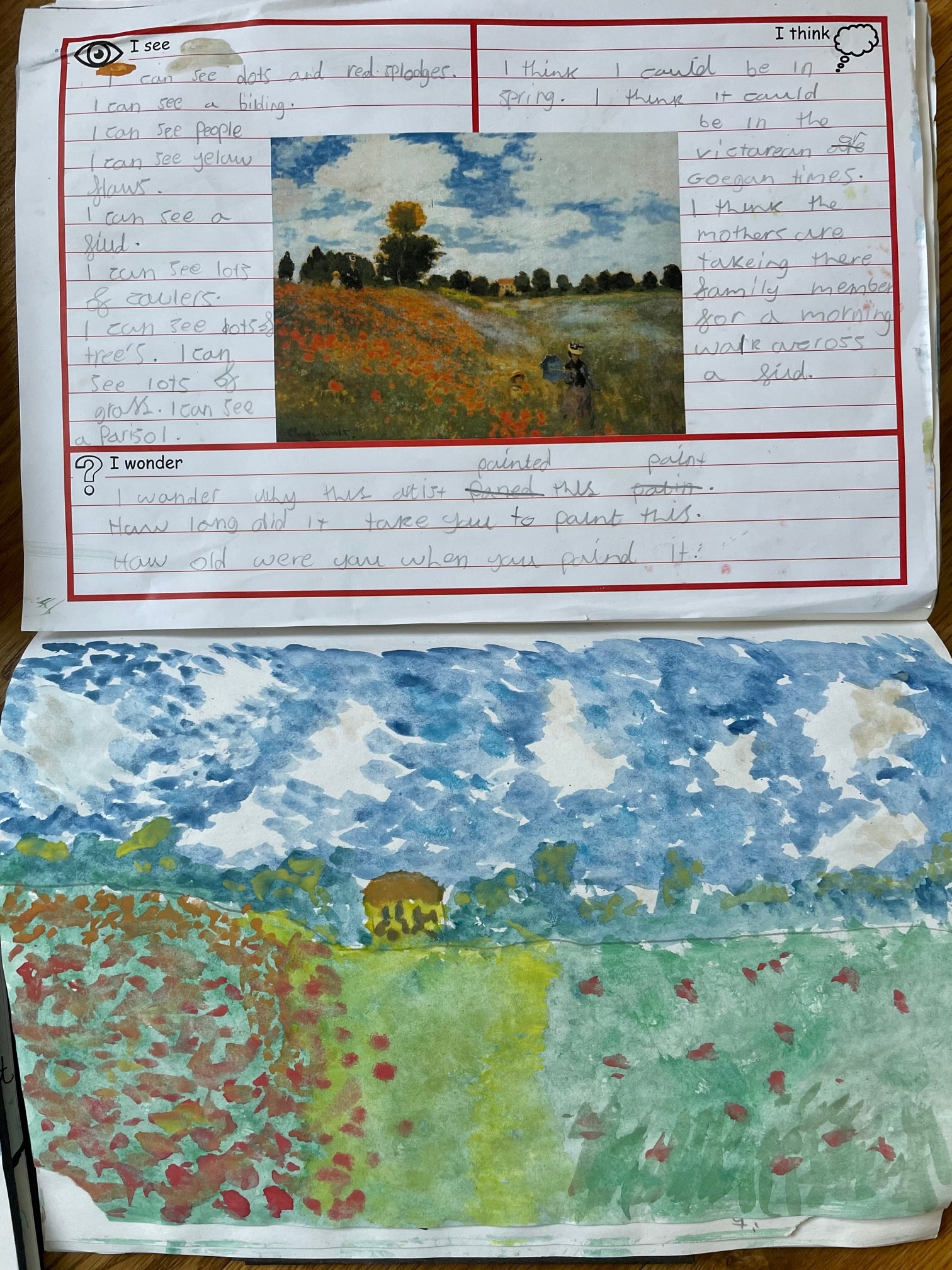 Class UKS2 was inspired by famous artists and recreated artwork using similar techniques to great painters, such as Monet’s impasto (fast, splodgy) brushstrokes painted quickly whilst outside. We use the “See, Think, Wonder” thinking routine to look at works of art in greater detail before creating our own.