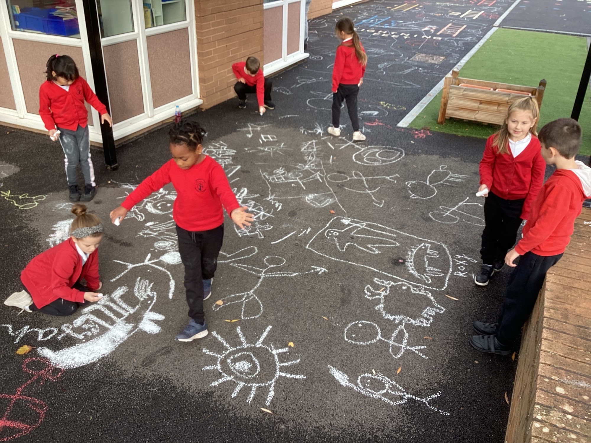 During art lessons we explore topics by creating artwork using materials used by the original artists. Class LKS2 created cave art in different ways, lying on their backs to draw on a ‘ceiling’, using their hands as stencils and experimenting making marks using charcoal, chalk and paint mixed from soils.