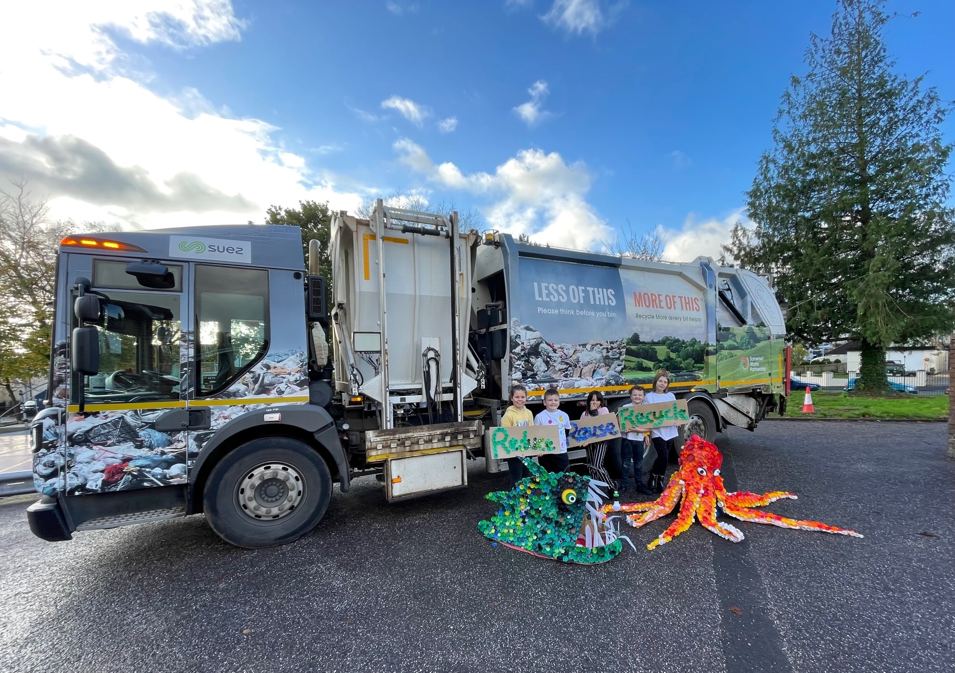 We recently came runners up out of hundreds of entries in a national bottle top sculpture competition. Our amazing sculptures are raising awareness for reducing, reusing and recycling have now found new homes and with the peacock displayed at Taunton Town’s football stadium and the angler fish and octopus collected in a Suez recycling lorry and are now at their Somerset and Devon depots.